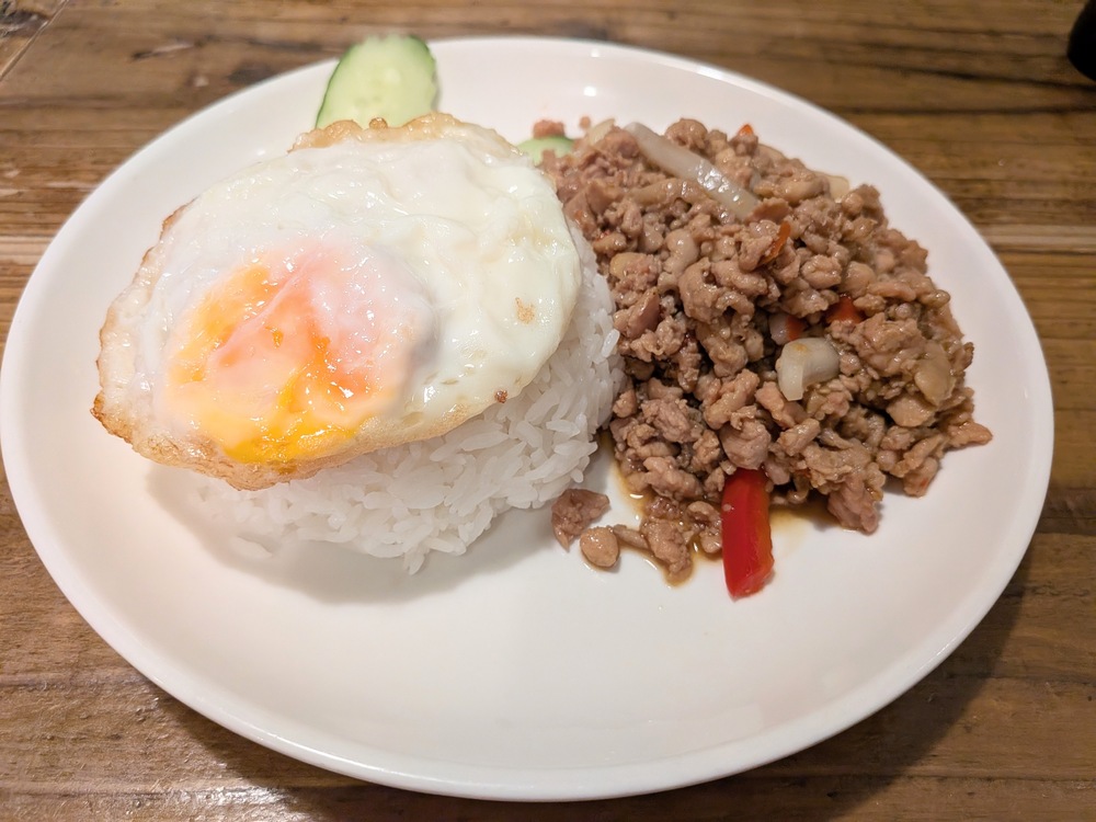 ディナーメニューが千円以下からあるなんて、タイ料理にしてはお手頃だなぁ!と思いながら待っていると、すぐにおいしそうなガパオライスが運ばれてきました。