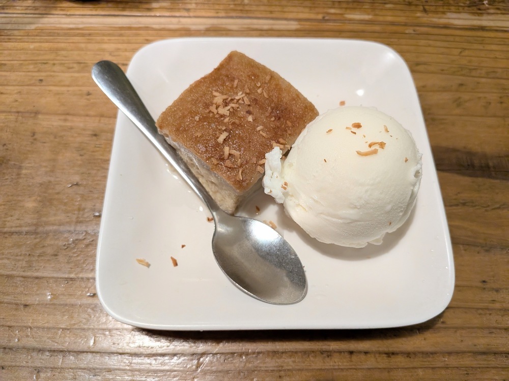 初めて食べるスイーツに少しドキドキしながらスプーンを入れると、ほんのり温かくやさしい甘さが広がります。食感はミルクが染み込んだスポンジケーキのようです。