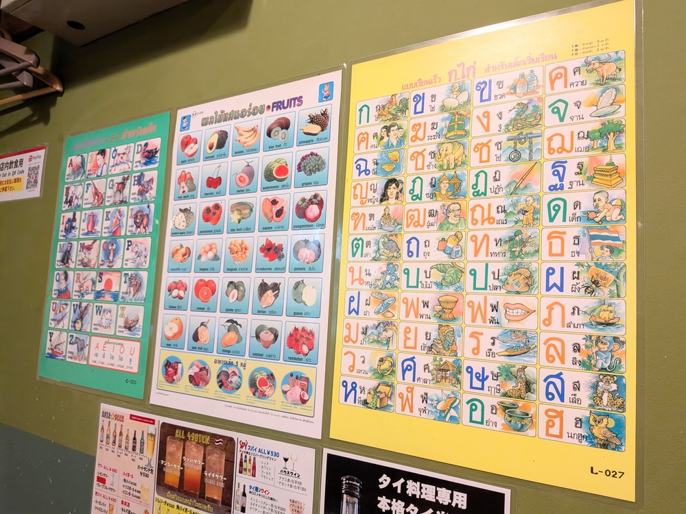 店内の壁でタイ語を勉強できます。料理を待っている間に眺めていましたが、タイ語はむずかしいですね。タイ文化への興味がますます広がります。