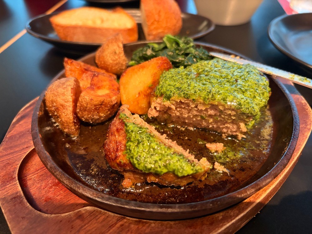 ソースはブルギニヨンバター、完熟トマトソース、黒デミグラス、照り焼きの4種類から選べ、今回はブルギニヨンバターを選びました。パセリとガーリックの風味がバターに溶け込み、ジューシーなハンバーグのうまみを一層引き立ててくれます。