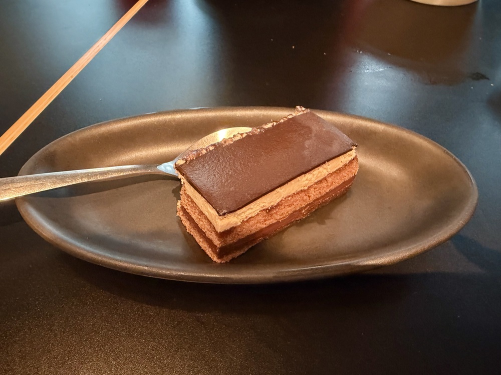 正直、ハンバーグでかなりお腹いっぱいだったのですが、目の前に運ばれてきた瞬間、その艶やかなチョコレートの層に思わずスプーンをのばしてしまいました。