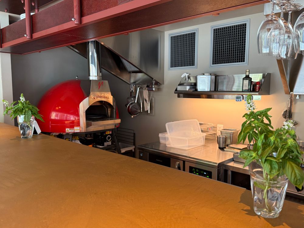 店内へ足を踏み入れると、まず視線を奪われるのが真っ赤なピザ窯。レンガ調の外観と相まって、まるで童話の世界に迷い込んだかのようです。