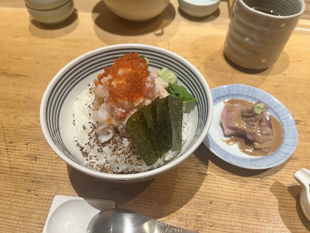 日本橋の行列店「日本橋海鮮丼 つじ半」の代名詞ともいえる「ぜいたく丼」。新鮮な海鮮の豪華さと、鯛だしで締める味わい深さは、やはり一度は並んで食べたい名物です。