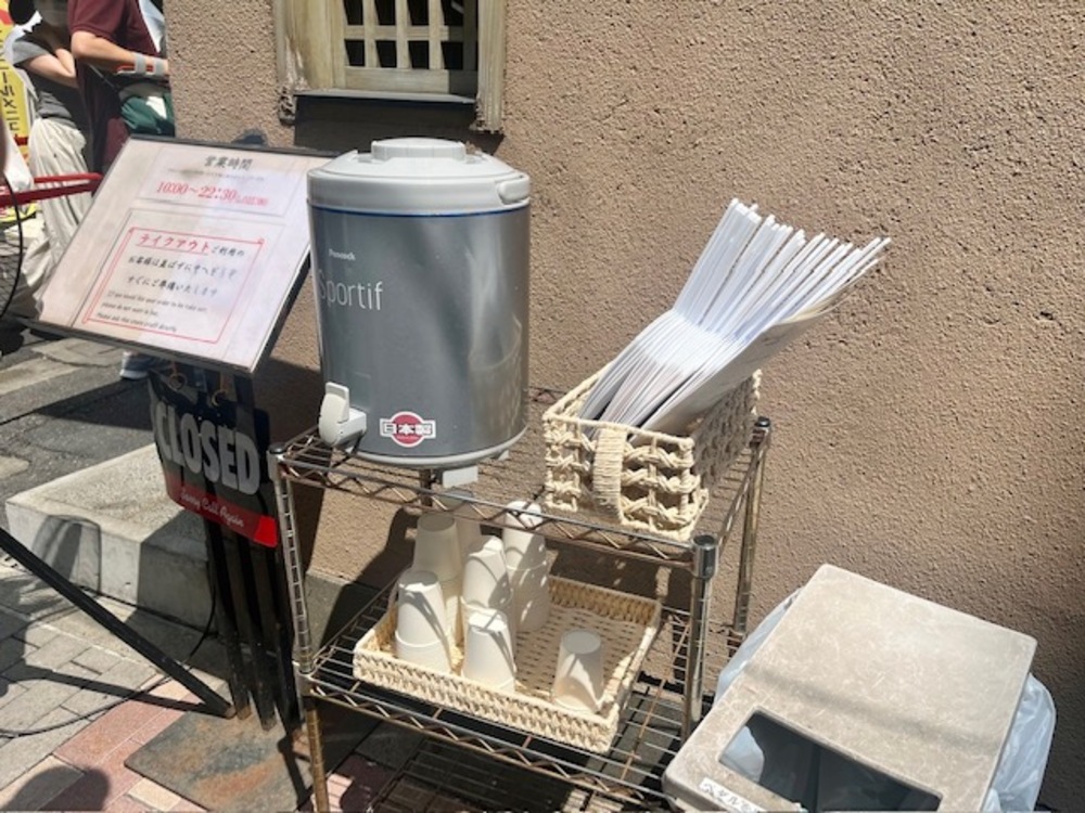 店の外には給水スペースや団扇、扇風機が設置されています。並んでいる人たちへの配慮がありましたが、この日は日差しが強く、日傘は必須でした。